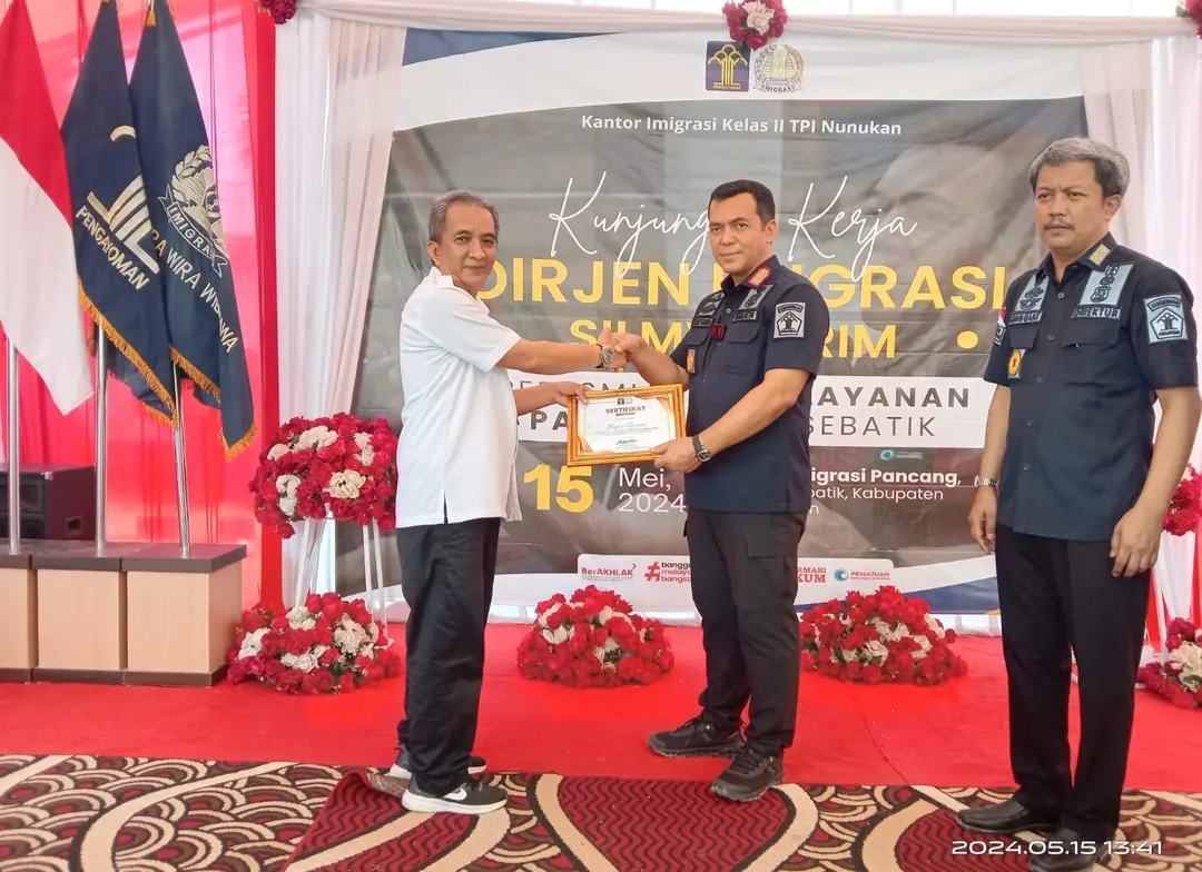 Dikesempatan tersebut, Silmy Karim juga menyerahkan sertifikat penghargaan pepada Pemerintah Kabupaten (Pemkab) Nunukan atas dukungan dan terwujudnya Unit Layanan Paspor (ULP) yang ada di Nunukan.