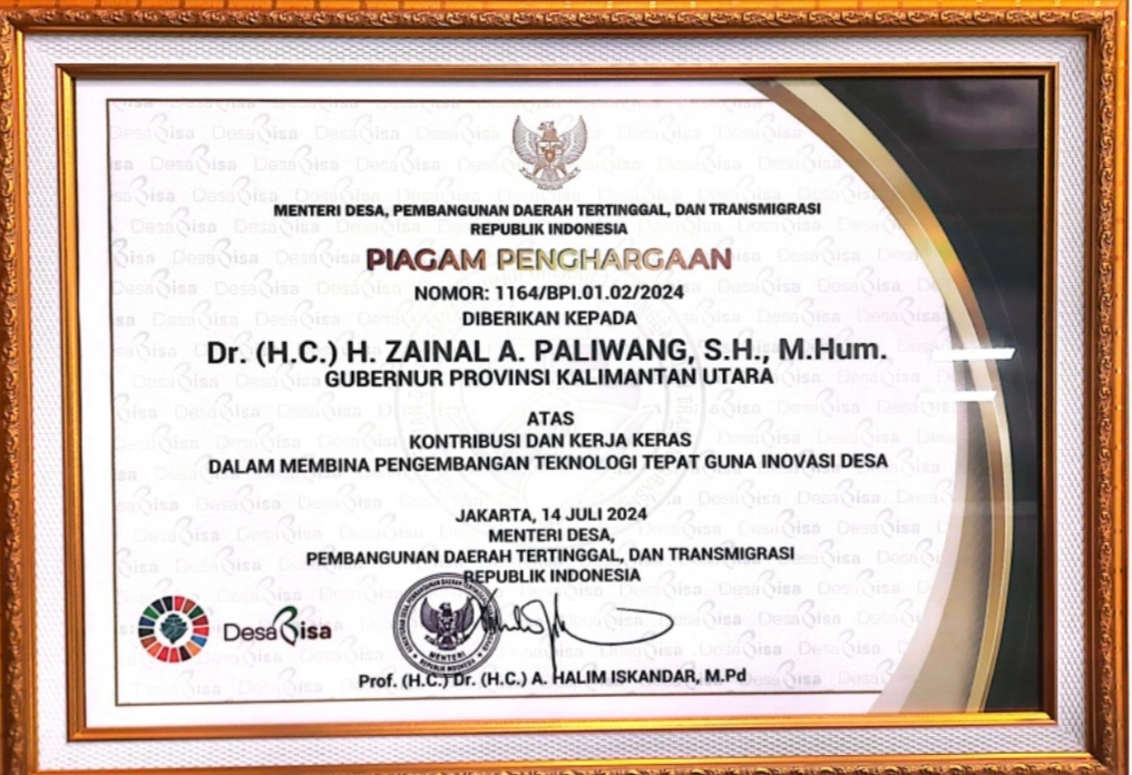 Piagam dan lencana ini disematkan oleh Mendes PDTT, Prof (HC) Dr (HC) Abdul Halim Iskandar, M.Pd kepada Gubernur Kaltara pada Gelar Teknologi Tepat Guna (TTG) Nusantara XXV di Lapangan Islamic Center Mataram, Provinsi Nusa Tenggara Barat, Senin (15/7) lalu.
