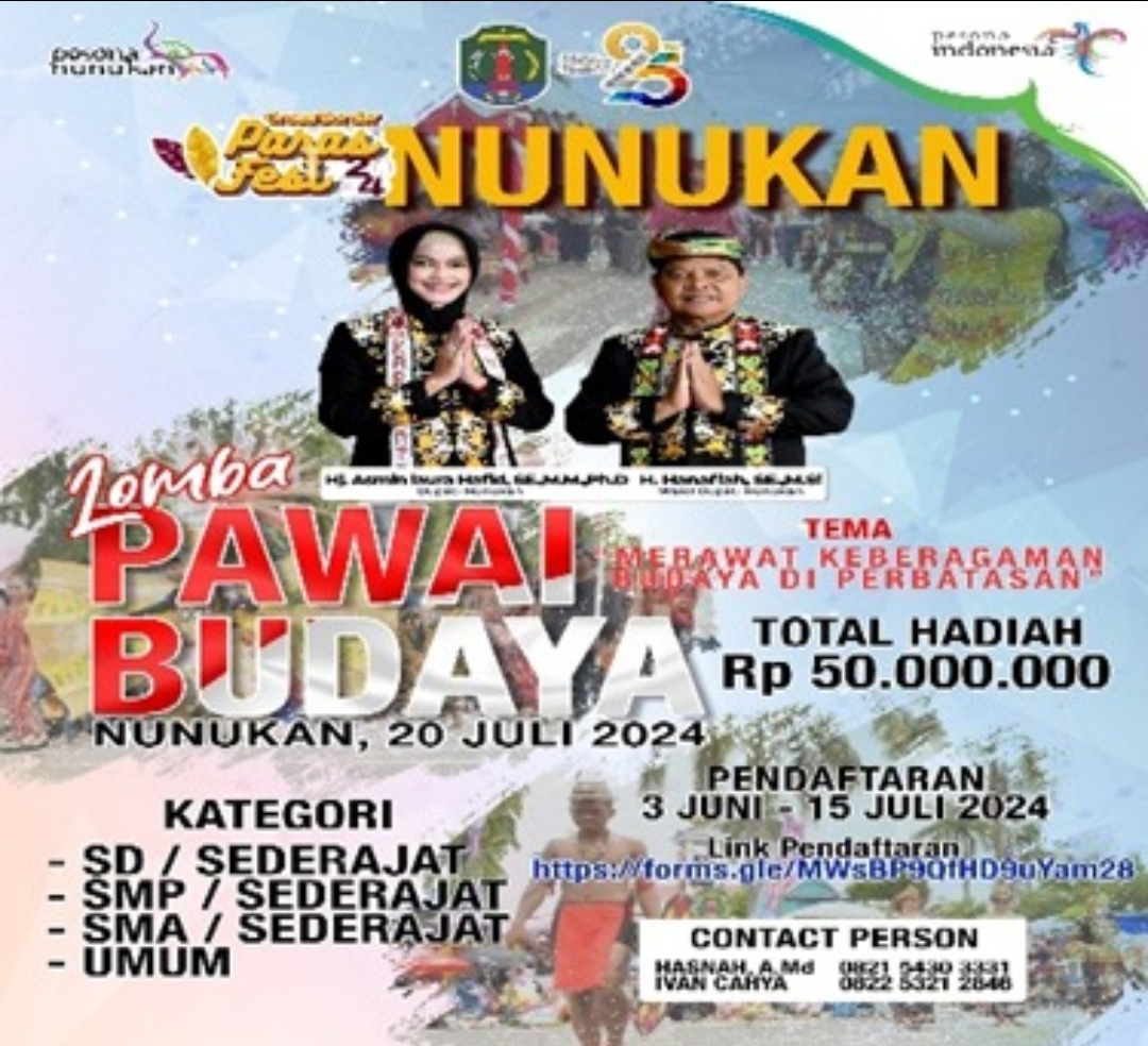 Nunukan,(Bacabah.com)-Kegiatan Pawai Budaya dalam rangka memperingati hari ulang tahun (HUT) Kabupaten Nunukan ke-25, semula dijadwalkan pada hari Minggu tanggal 21 Juli 2024 dimajukan satu hari, ke Hari Sabtu tanggal 20 Juni 2024.