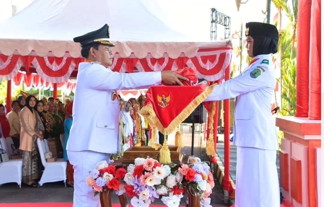 Diiringi Lagu Kebangsaan Indonesia Raya, penurunan bendera merah putih berjalan dengan lancar. Duplikat bendera pusaka selanjutnya diserahkan kepada Inspektur Upacara untuk disimpan kembali”. (**/Prokompim).