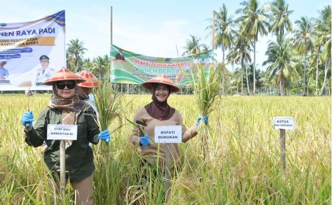 Nunukan,(Bacabah.com)-Bupati Nunukan, Hj. Asmin Laura Hafid bersama Staf Ahli Kementerian Pertanian dan Ketahanan Pangan ( Kementan ) Republik Indonesia Pamuji Lestari melakukan Panen Raya bersama masyarakat di hamparan sawah kelompok tani Mamminasae Kecamatan Sebatik Timur, Minggu 18 Agustus 2024.