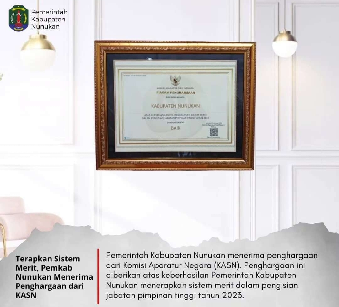 Penghargaan ini diberikan atas keberhasilan Pemerintah Kabupaten Nunukan menerapkan sistem merit dalam pengisian jabatan pimpinan tinggi tahun 2023.