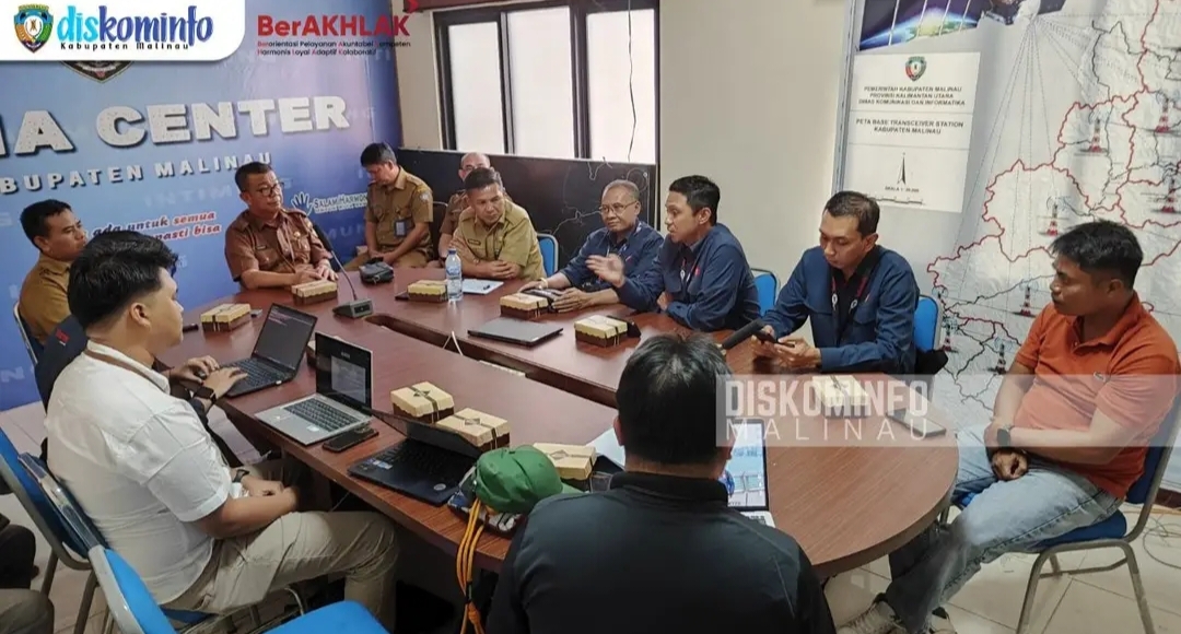 Malinau,(Bacabah.com)-Kepala Dinas Komunikasi dan Informatika (Diskominfo) Kabupaten Malinau, Francis, S.Pd., M.Pd., bersama Dinas PUPR Perkim Kabupaten Malinau mengadakan pertemuan dengan perwakilan Telkom dan Telkomsel guna membahas permasalahan gangguan jaringan internet yang kerap terjadi di wilayah Malinau. Pertemuan ini berlangsung di ruang Media Center Diskominfo Malinau pada, Selasa (11/2/2025).
