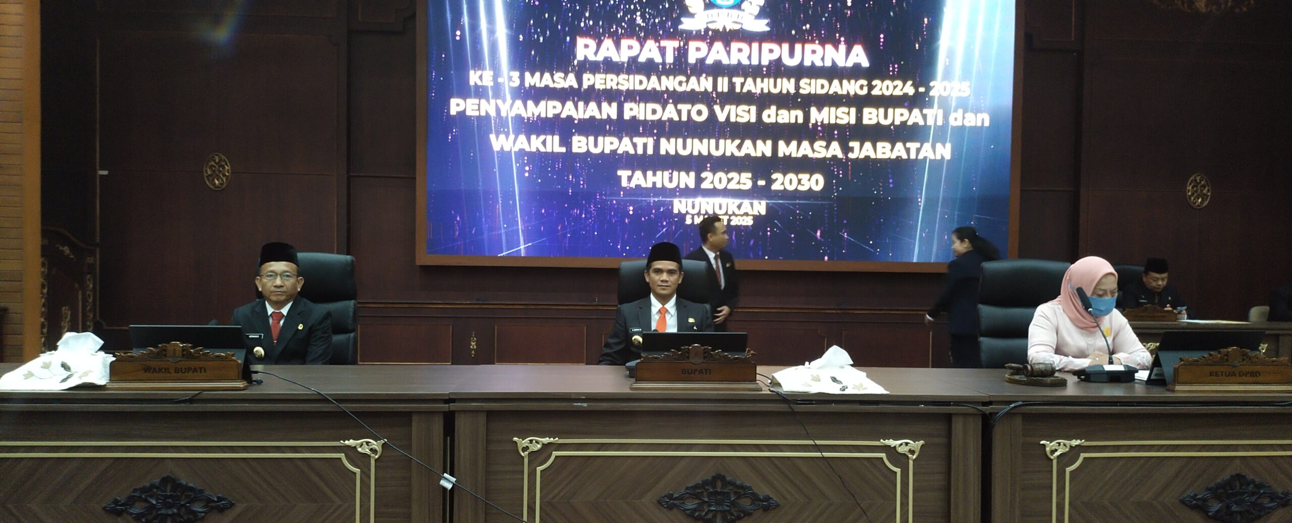 Rapat Paripurna tersebut digelar diruang rapat paripurna Gedung DPRD Kabupaten Nunukan pada, Rabu (5/3/25) yang dipimpin oleh Ketua DPRD Kabupaten Nunukan, Hj. Leppa yang dihadiri oleh seluruh anggota DPRD unsur Forkopimda, Instansi Vertikal, Pimpinan Parpol, para camat, Tokoh Masyarakat serta sejumlah awak media.