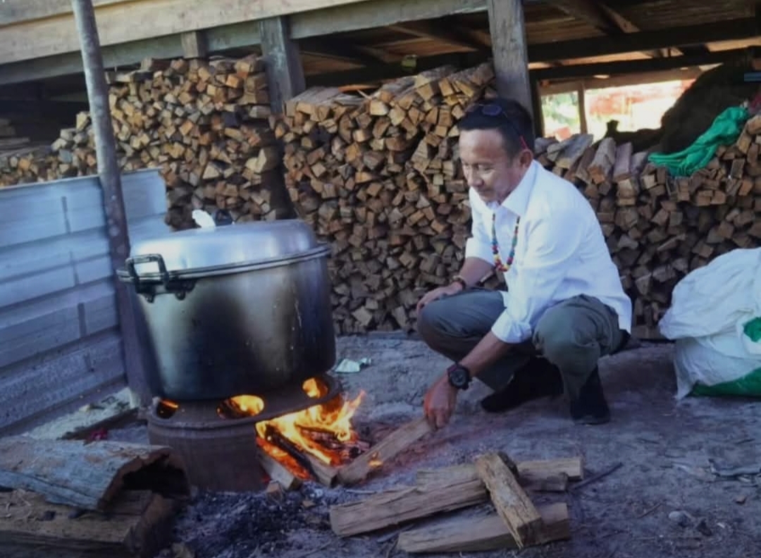 Sambil berjongkok, Hermanus bahkan ikut memasukkan kayu bakar ke dalam tungku pemasak.