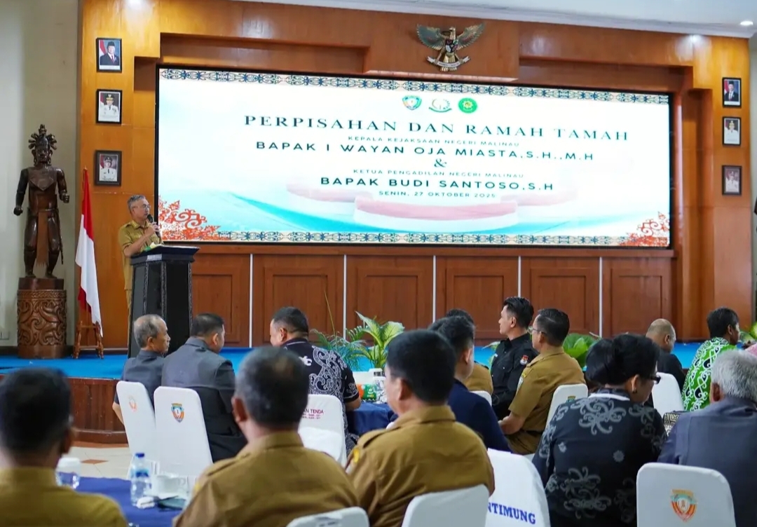 Malinau,(Bacabah.com)-Bupati Malinau Wempi W Mawa, S.H., M.H., menghadiri acara pisah kenang Kajari Malinau, I Wayan Oja Miasta, S.H., M.H., dan KPN Malinau, Budi Santoso, S.H., pamit meninggalkan Kabupaten Malinau setelah bertugas selama beberapa tahun, bertempat di Ruang Laga Feratu, Senin ( 27/10/2025 ) pagi.